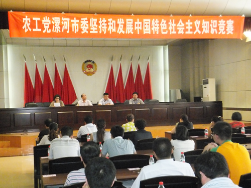6月28下午,农工党漯河市委在市政协常委会议室举办“坚持和发展中国特色社会主义”知识竞赛活动,漯河市政协副主席、农工党漯河市委主委邓武昌亲临现场检查和指导,并兼任主考官,农工党河南省委派专人到漯河巡视和指导活动。来自市中心医院总支和5个基层支部的50名党员参加了竞赛。竞赛采取闭卷、书面答题的方式,内容涉及中共十八大、十八届三中全会精神、习近平总书记系列重要讲话精神、社会主义核心价值体系、多党合作和统一战线理论,农工党章程、地位、优良传统等方面。竞赛使广大党员进一步准确把握中国特色社会主义理论体系的丰富内涵、主要内容和实践要求,增强广大党员坚持中国特色社会主义道路、理论、制度--“三个自信”的自觉性和坚定性。
